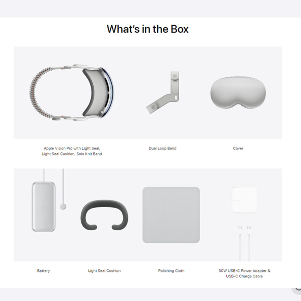 - In the Box: Apple Vision Pro (Includes Light Seal, Light Seal Cushion, and Solo Knit Band), Cover, Dual Loop Band, Battery, Light Seal Cushion, Polishing Cloth, 30W USB‑C Power Adapter, USB‑C Charge Cable (1.5m)